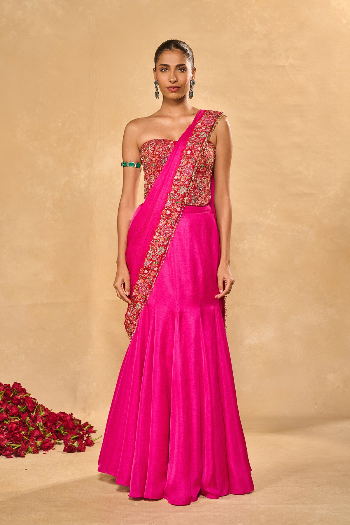 Hot pink soft silk pre-draped saree with a contrast richly embroidered appliqué border paired with a red raw silk corset detailed with floral motifs in resham, glass beads, zardozi, pearls, zari and sequence