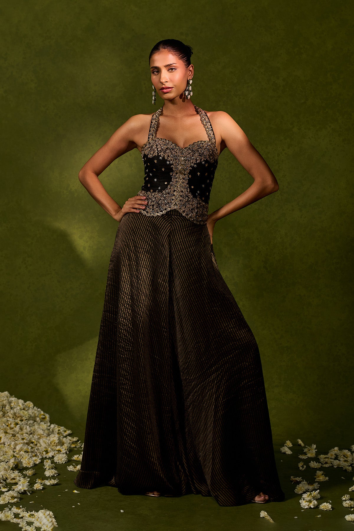 Tissue jamewar flared pants paired with a statement halter blouse, richly embellished with zari, pearls, glass beads, sequence, zardozi and stone work and an organza dupatta, softly adorned with delicate embellishments