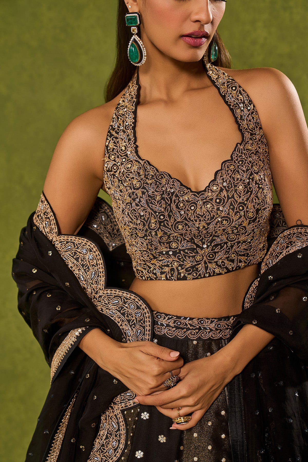 Black tissue woven jamewar lehenga, delicately embroidered with a zari hem paired with a richly embroidered halter-neck blouse, intricately detailed with zari, sequence, zardozi, and glass beads and an embellished organza dupatta