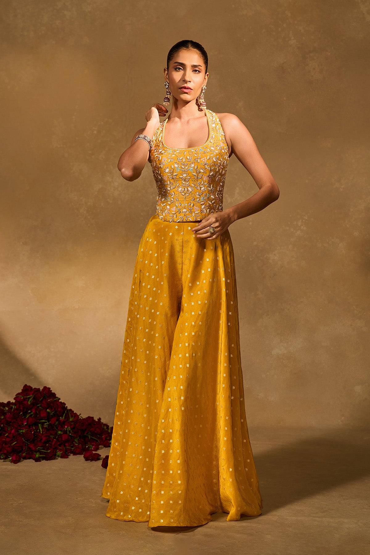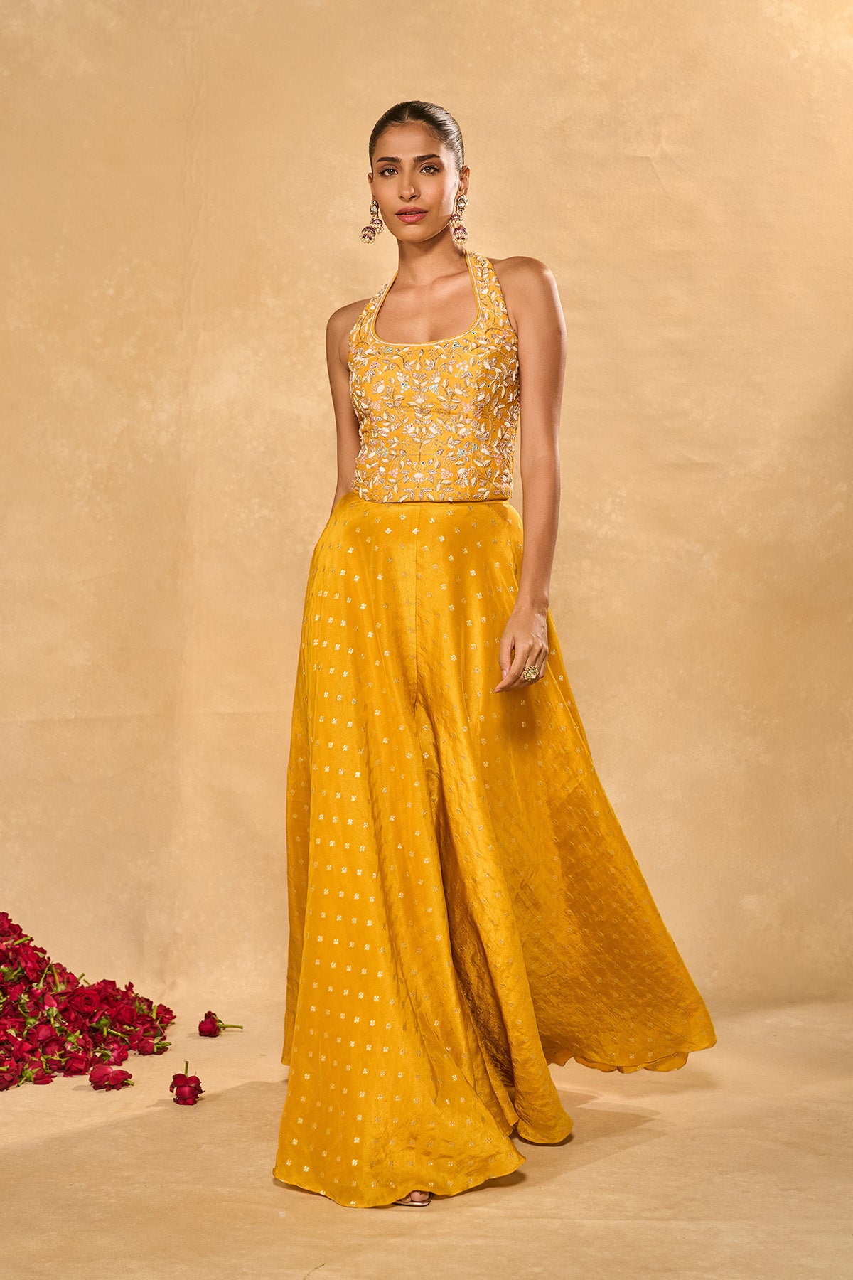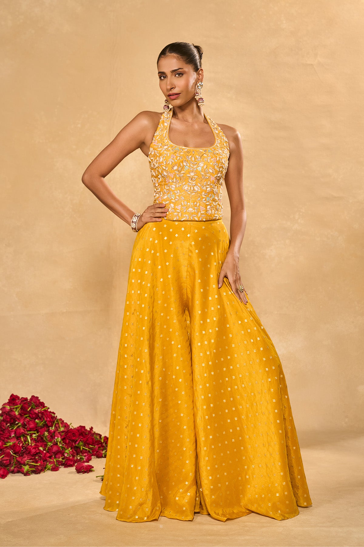 On The Model: Model Size- S (small), Model Height - 5 Feet 8 Inches, Neckline - Halter , Neck Depth - 8.5 inches, Blouse Length- 18.5 inches, Pant Length - 44inches
