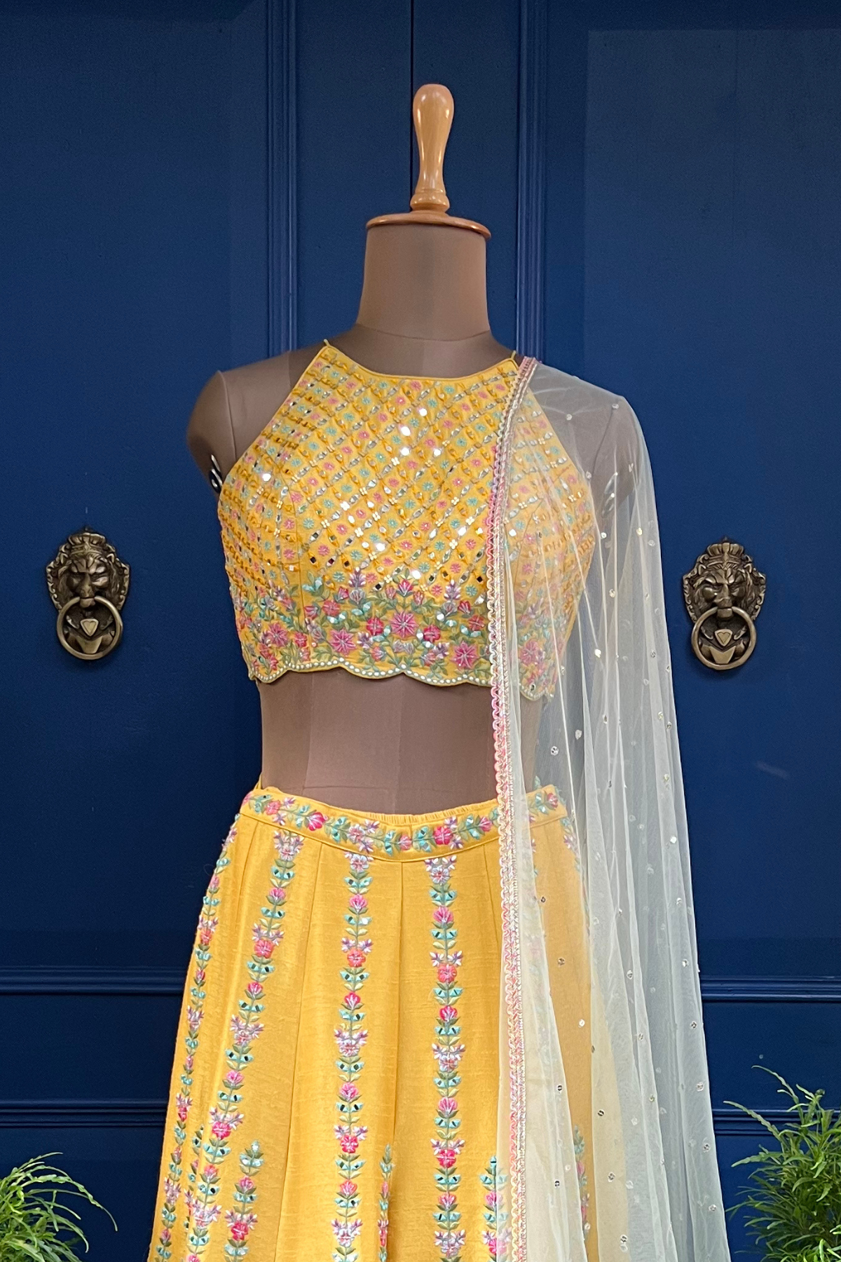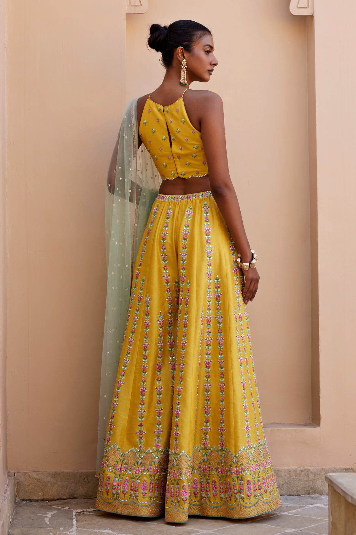 Yellow dupion silk resham and mirror work embroidered pants and incut shoulder top paired with contrast tulle dupatta.