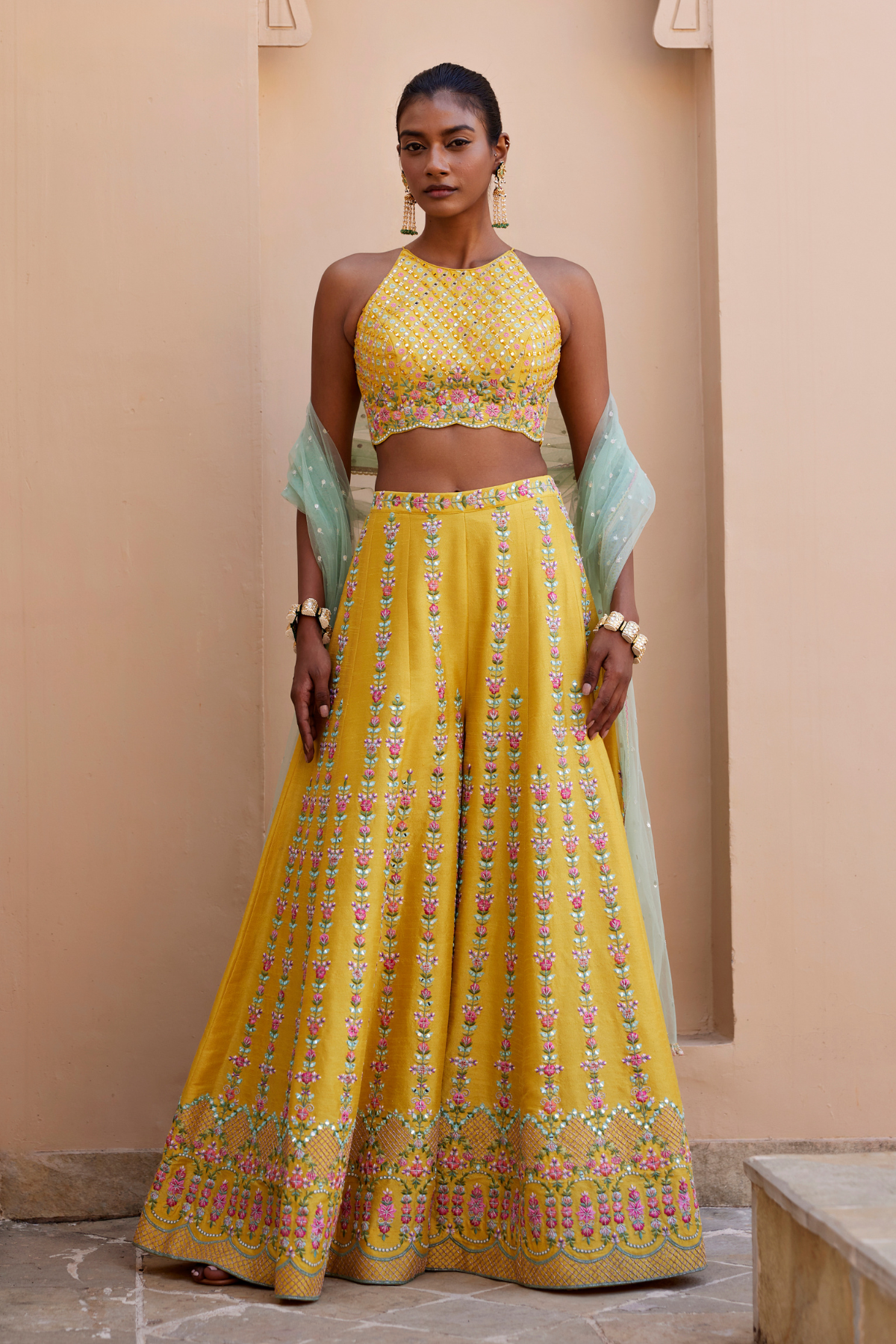 Regular price INR 58,000.00Yellow dupion silk resham and mirror work embroidered pants and incut shoulder top paired with contrast tulle dupatta.