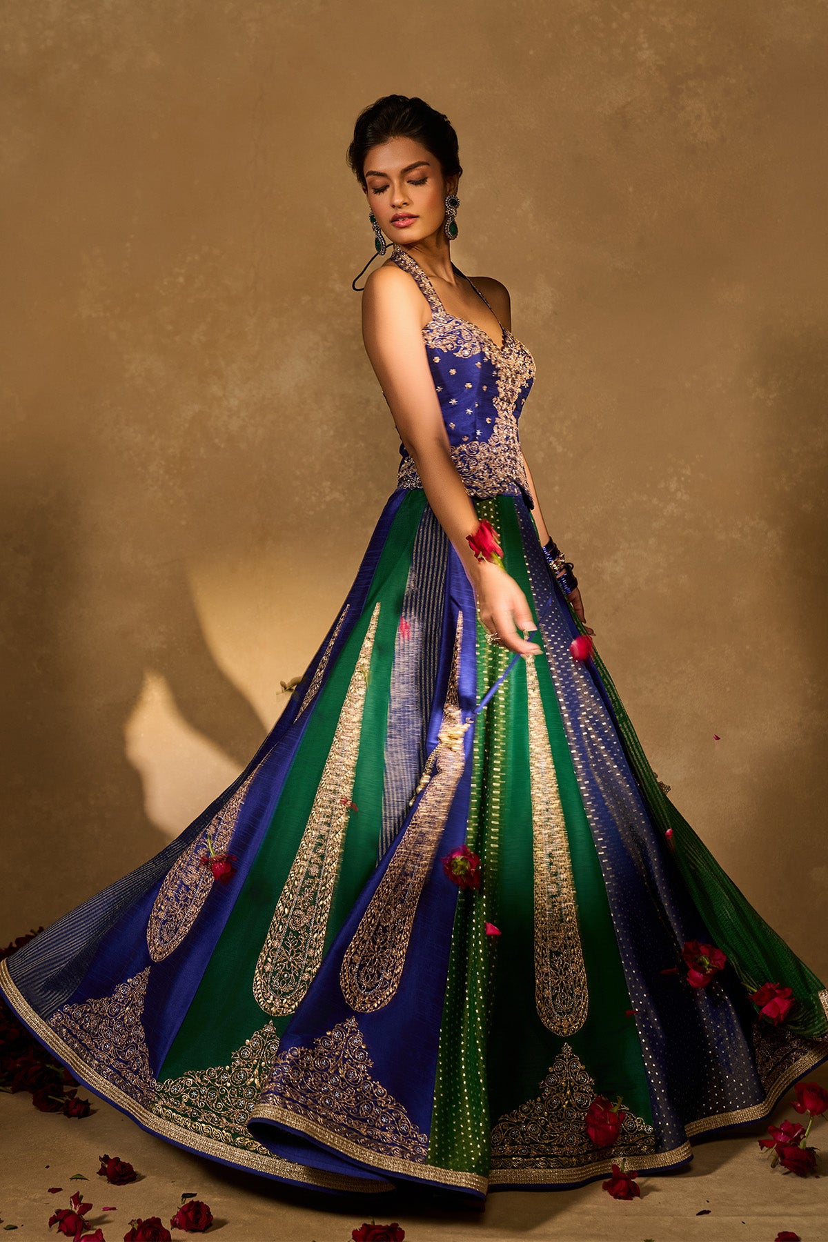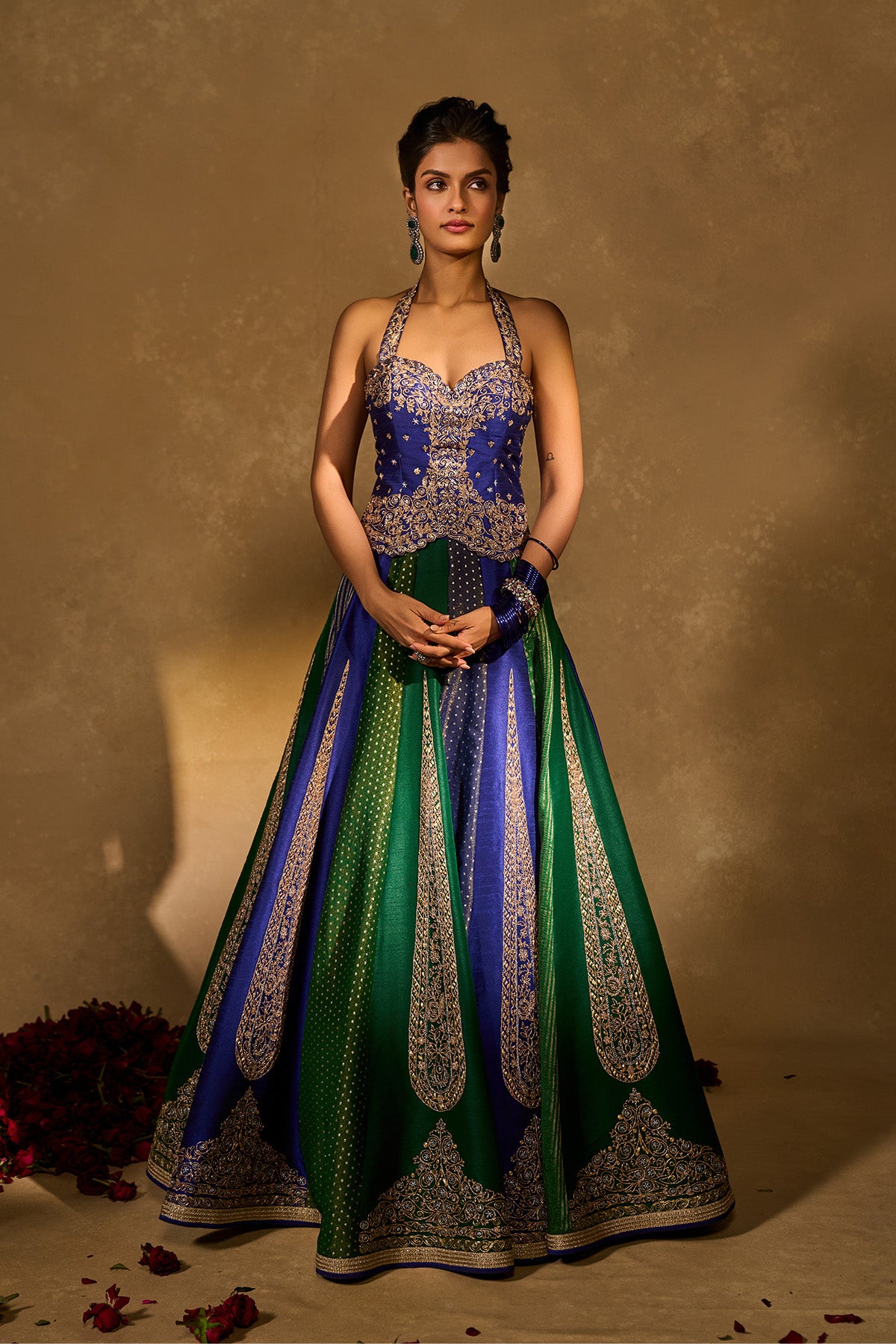 Blue and green dupion silk and tissue jamewar 10 kali lehenga, intricately woven and delicately encrusted with zari embroidery paired with a blue halter-neck blouse embellished with zari, sequence and glass beads, and a sheer blue organza dupatta with green appliqué embroidered border