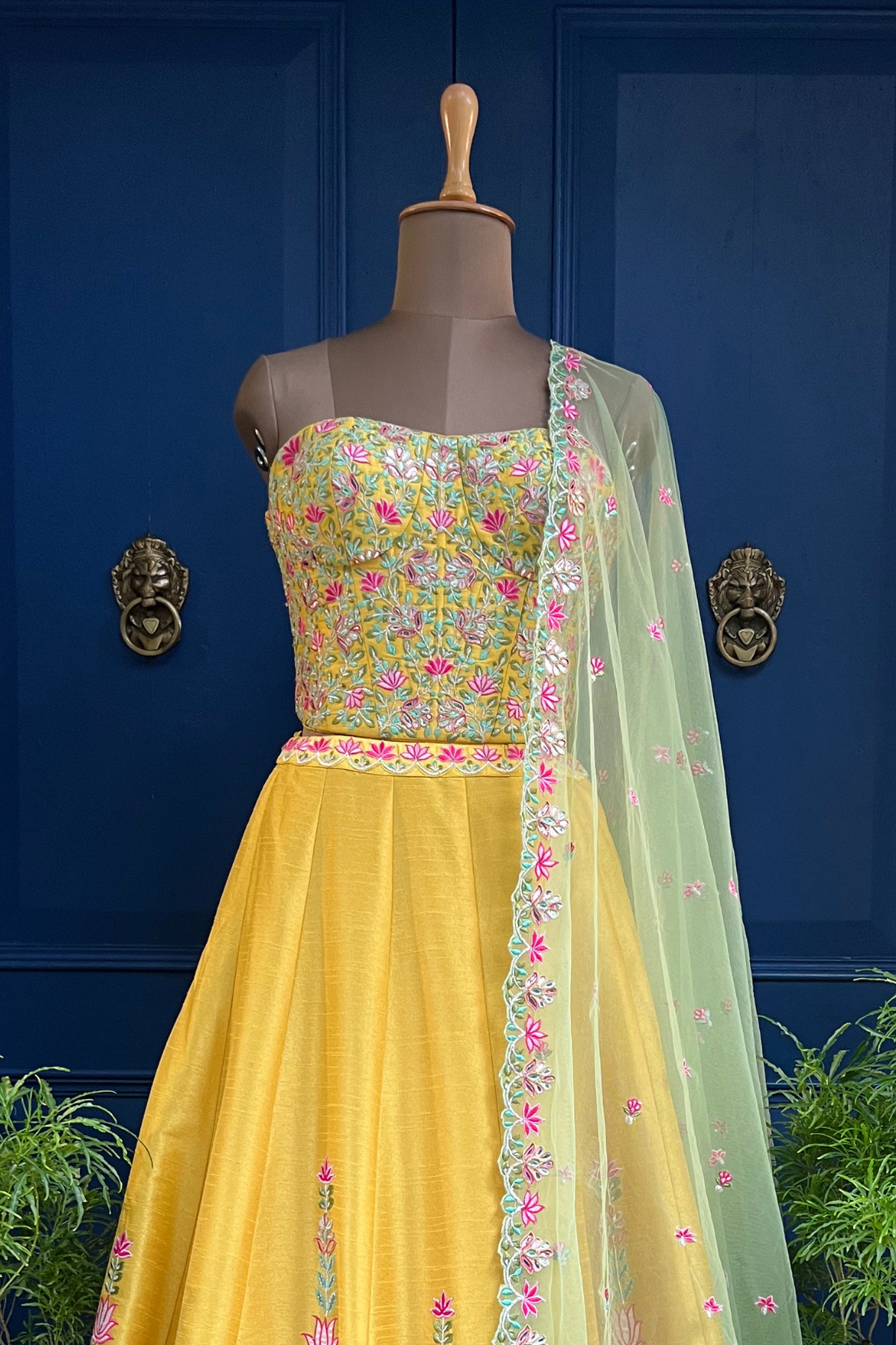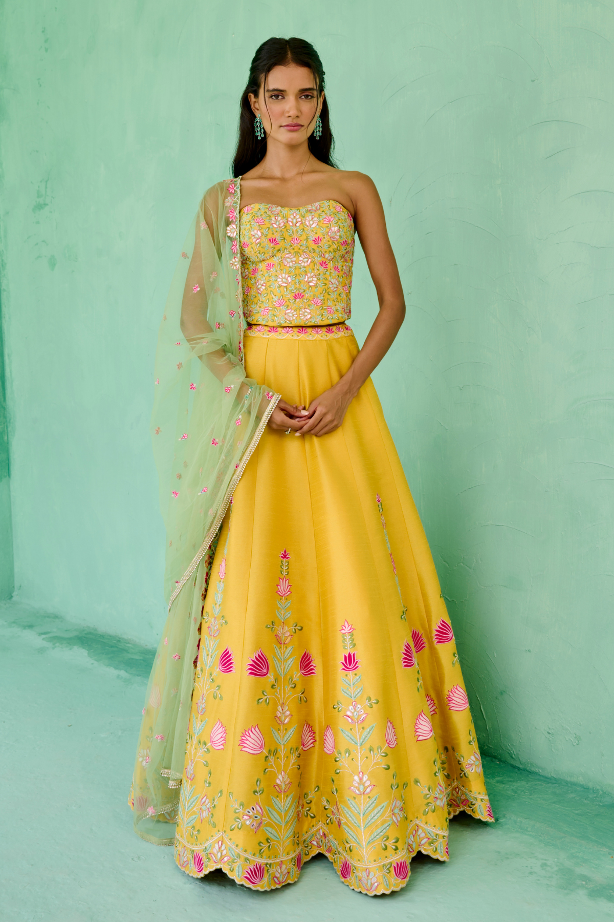 Tulip lehenga and corset blouse with colorful resham and faux metallic leather embroidery paired with contrast green embellished tulle dupatta.