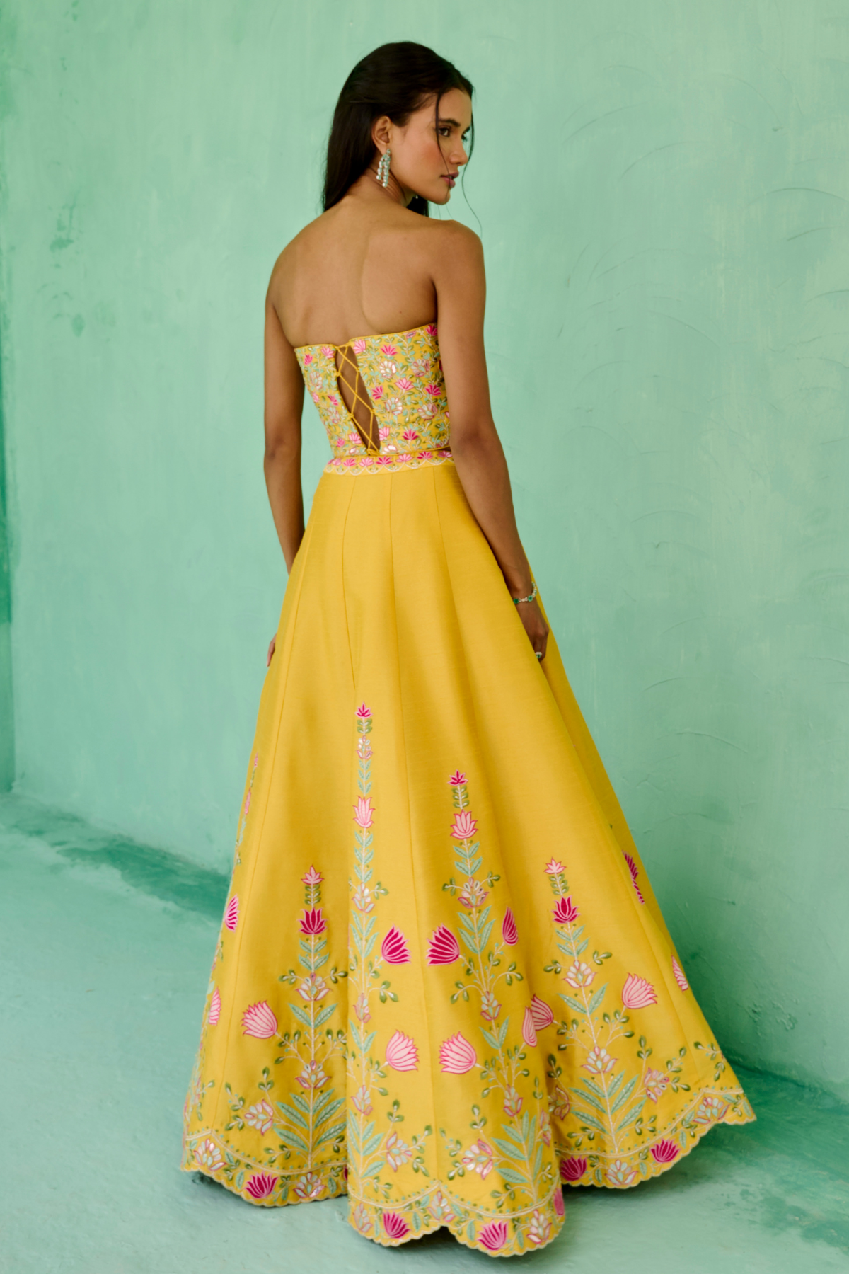 Regular price INR 61,000.00Tulip lehenga and corset blouse with colorful resham and faux metallic leather embroidery paired with contrast green embellished tulle dupatta.