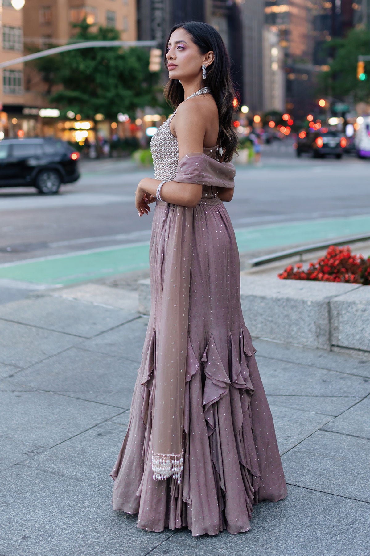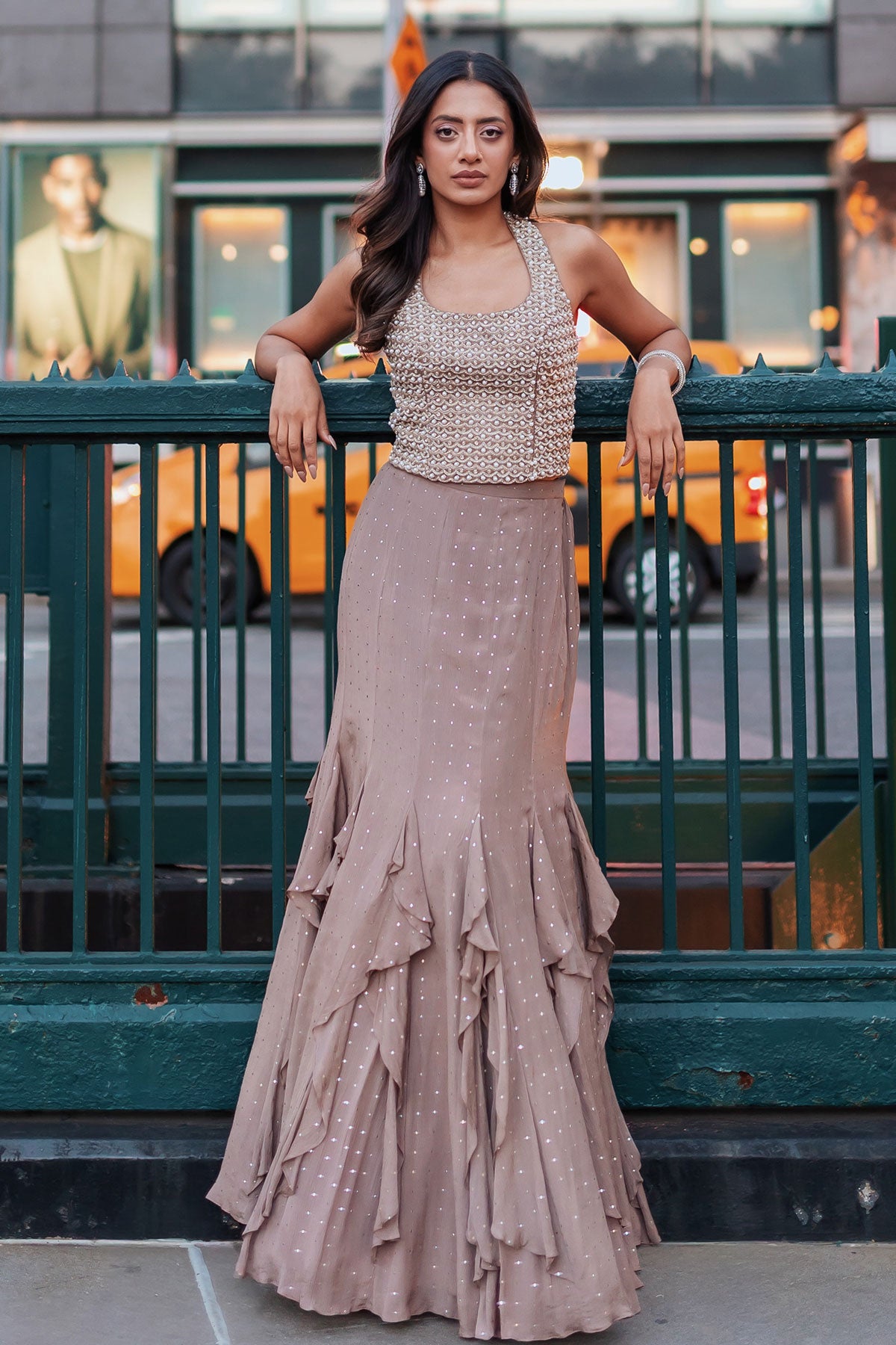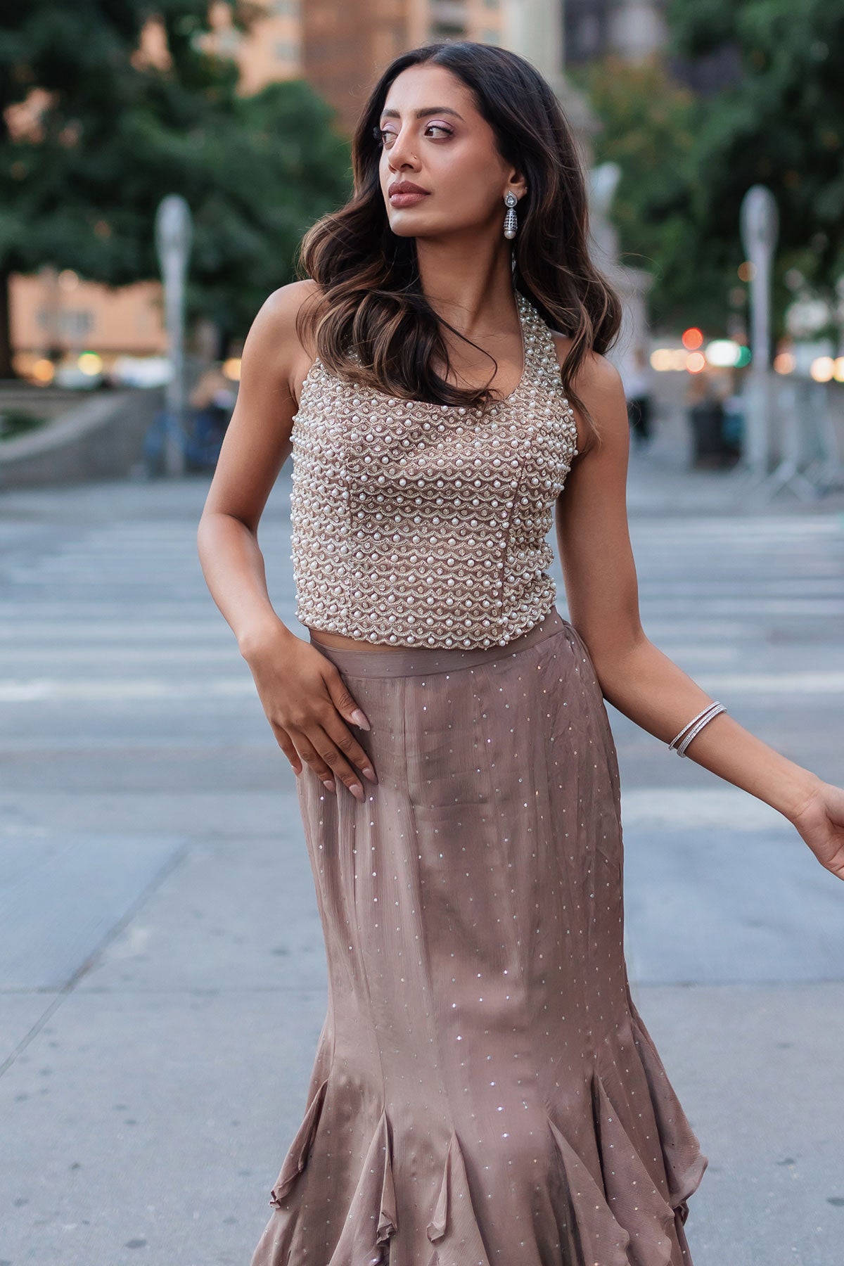 Sequence embellished gusset skirt paired with glassbeads and pearl embroidered halter neck corset and embellished tulle dupatta