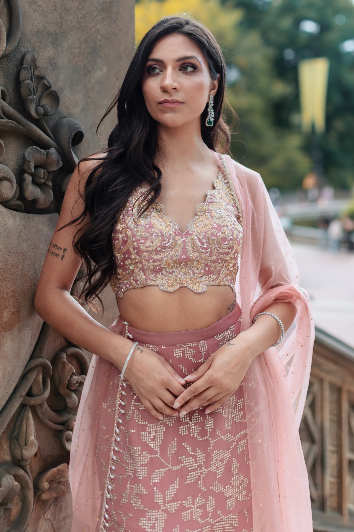 Fit and flare skirt with floral sequence embellishments paired with sequence and glassbeads embroidered blouse and tulle dupatta.