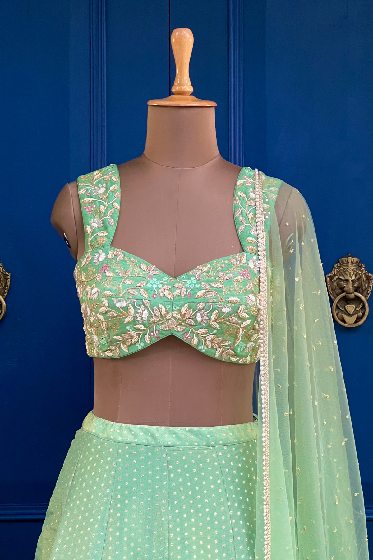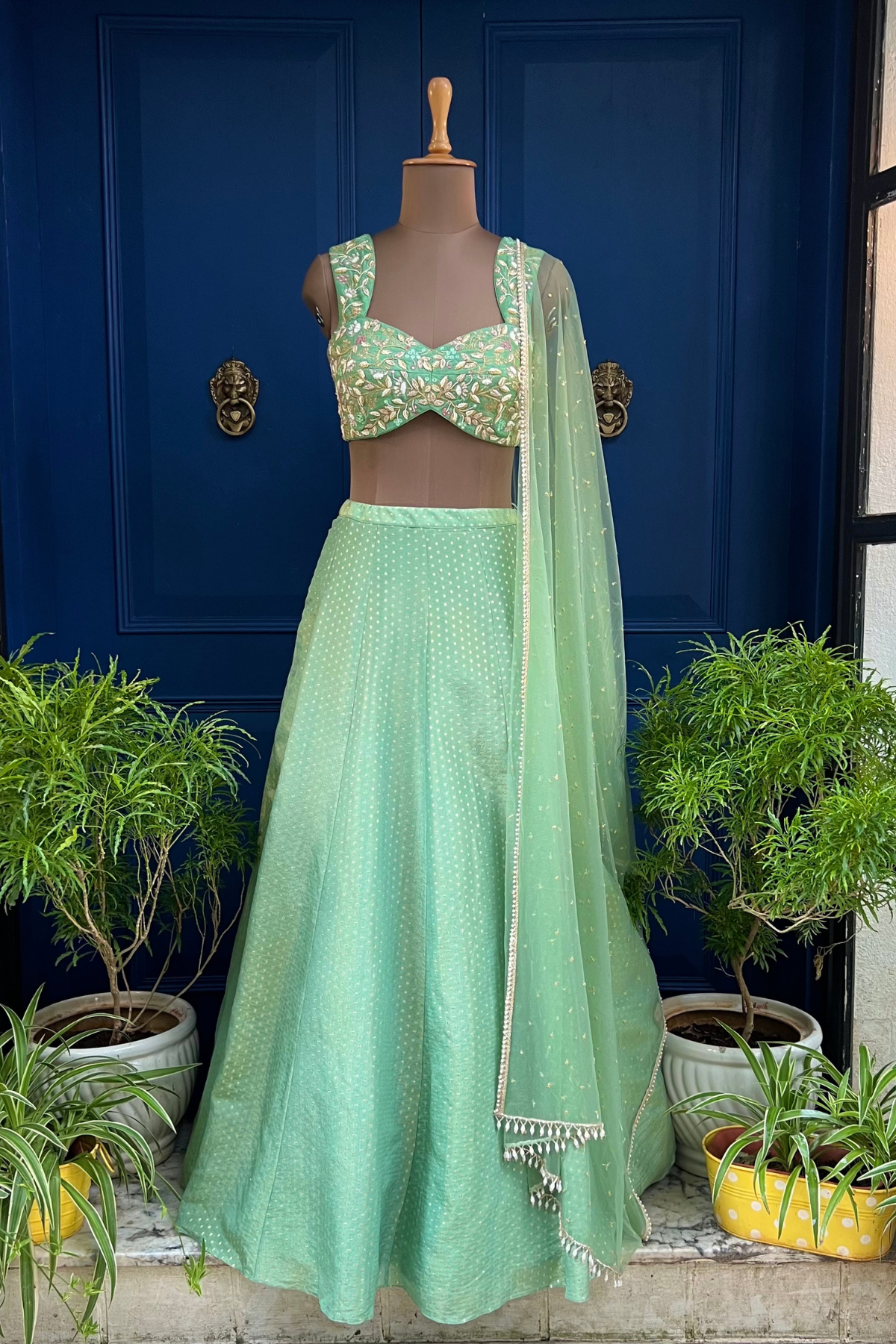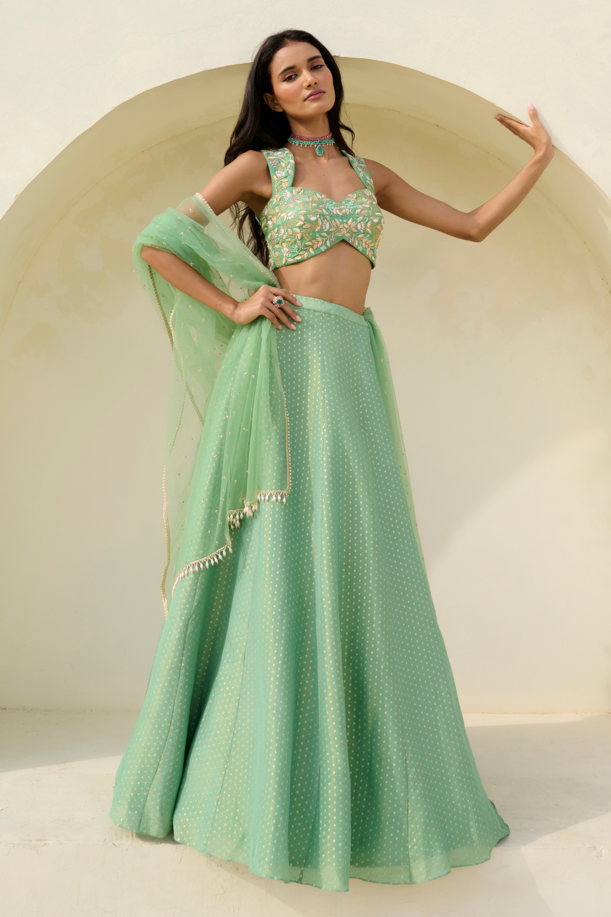 Tissue brocade polka woven lehenga paired with glassbeads, pearl and sequence embroidered blouse and tulle dupatta.