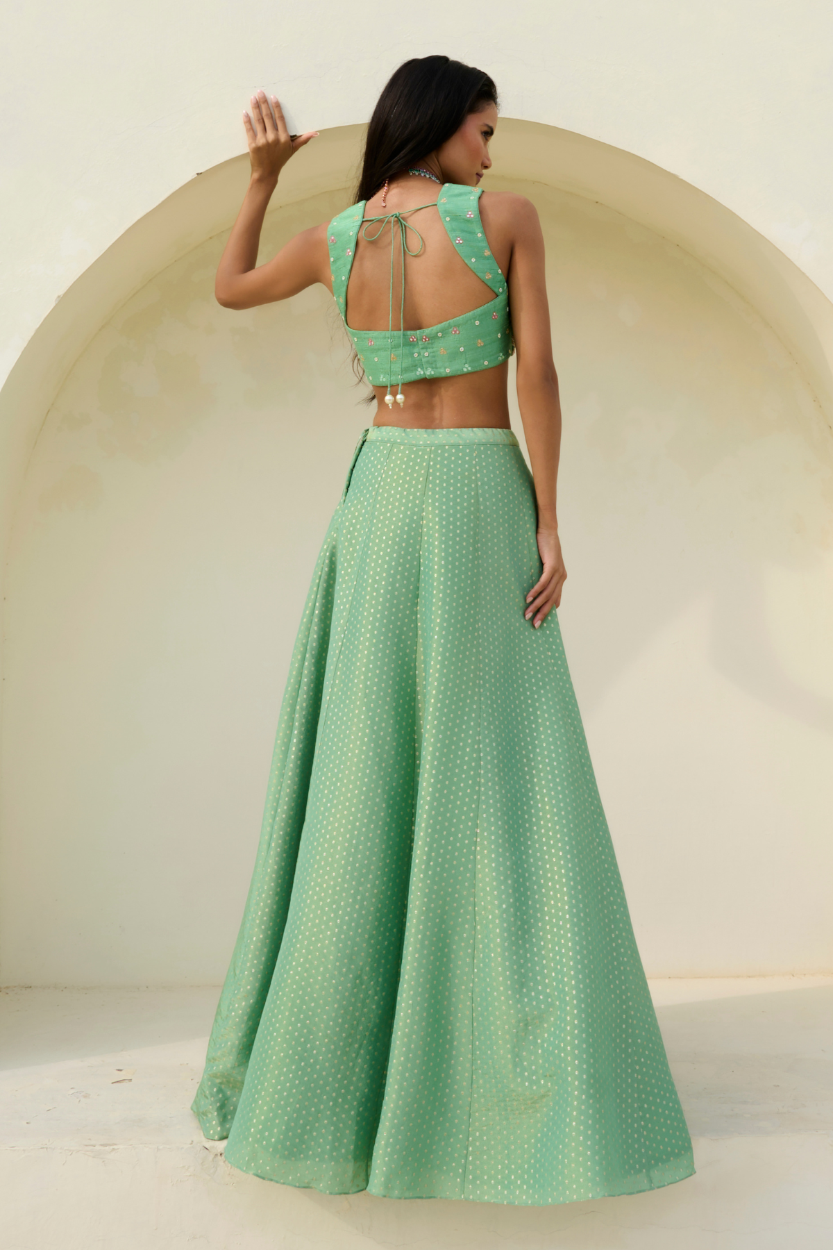 Regular price INR 39,500.00Tissue brocade polka woven lehenga paired with glassbeads, pearl and sequence embroidered blouse and tulle dupatta.
